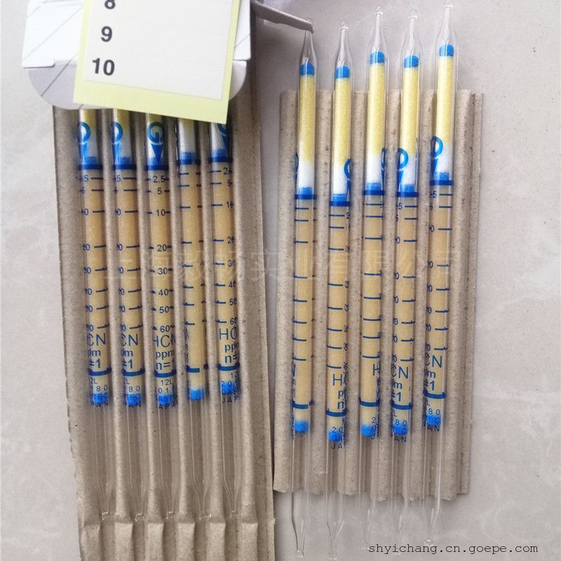氰化氢检测管是一根密封的细长玻璃管,因为填充有特定的试剂和着色剂而呈现特定的颜色,当含有氰化氢的气体样品进入检测管后,会发生化学变化,从而引起颜色的变化。观察颜色变化的界限对应的刻度,即是被测样品中的氰化氢的浓度。